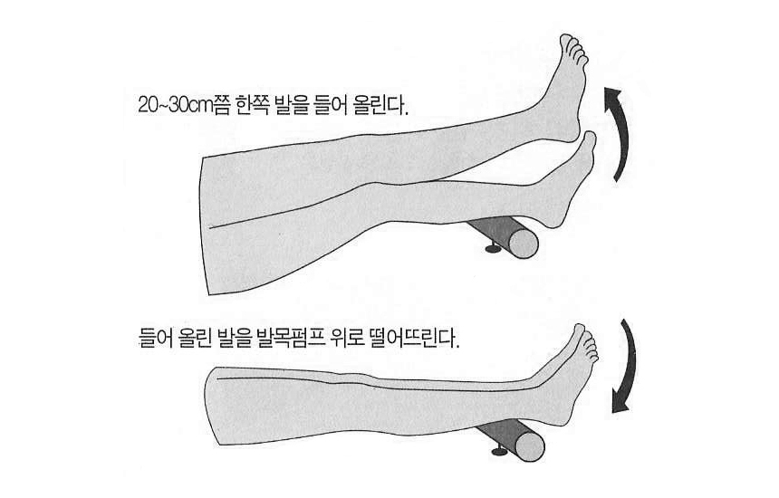 2.오른발 25번, 왼발 25번 (한발씩 25회)을 1회 1세트로 하여 10세트 정도하는 것을 최종목표(각각 250회)로 하되 처음에는 조금씩 시작하여 몸의 상태에 맞게 세트를 조금씩 늘려 나간다.