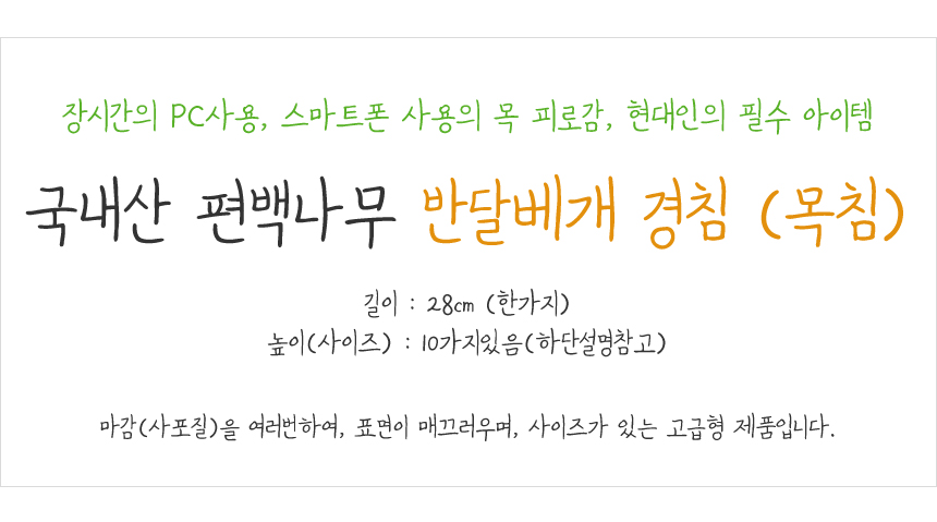 사용시 딱딱하고 아픈사람은 경침위에 수건 같은 부드러운 천을 깔고 사용하고 적응한 뒤에는 천을 빼고 사용 하시면 됩니다. 높이 조절용으로는 경침 바닥에 수건을 깔고 사용하시면 됩니다.