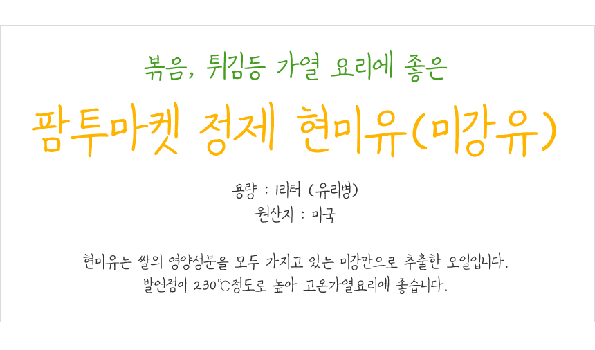 정제현미유는 생식으로는 어려우며, 각종 볶음, 튀김요리에 사용가능합니다.