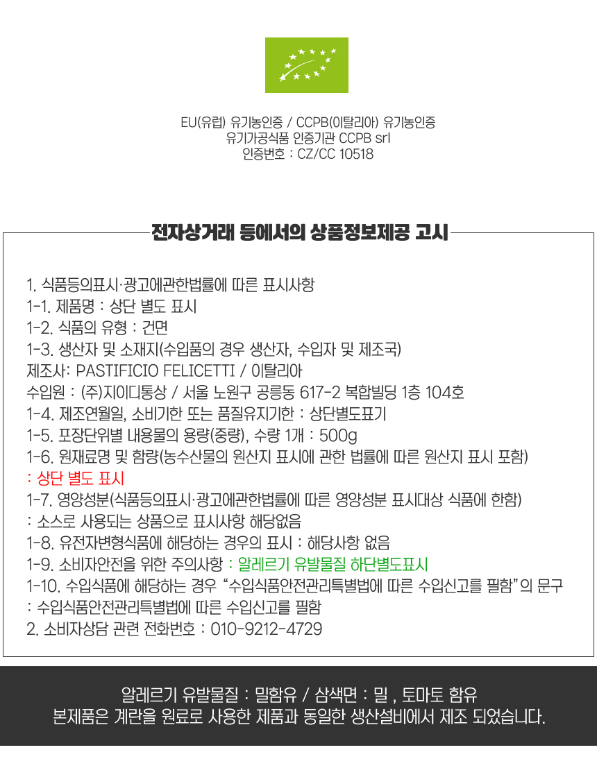 100년이 넘는 전통의 브론즈(Bronzo)방식으로 이태리 북부 알프스 청정지역에서 생산되며 세계적인 유기식품연구소와의 협조프로그램을 통하여 관리되며, 알프스산맥의 해발 2000meter에서 나오는 청정 물만을 사용하여 제조하고 건조하여 특유의 풍미를 더하여 줌으로써 최고의 맛과 안전하고 인증된 제품의 품질을 유지합니다.