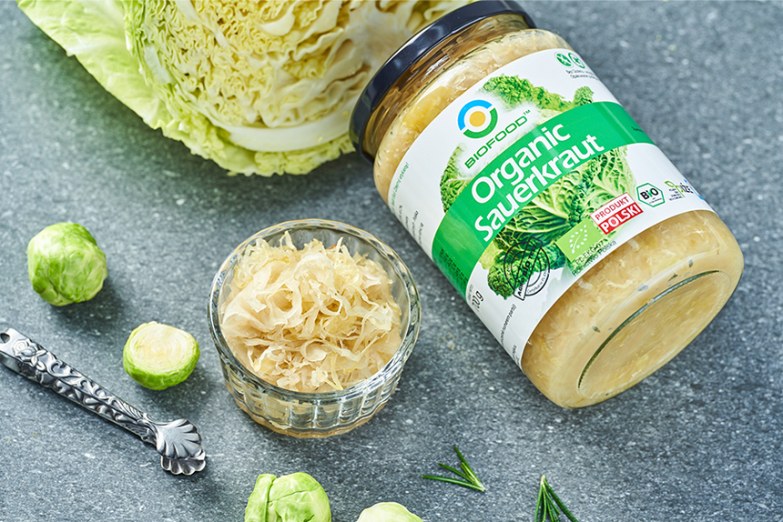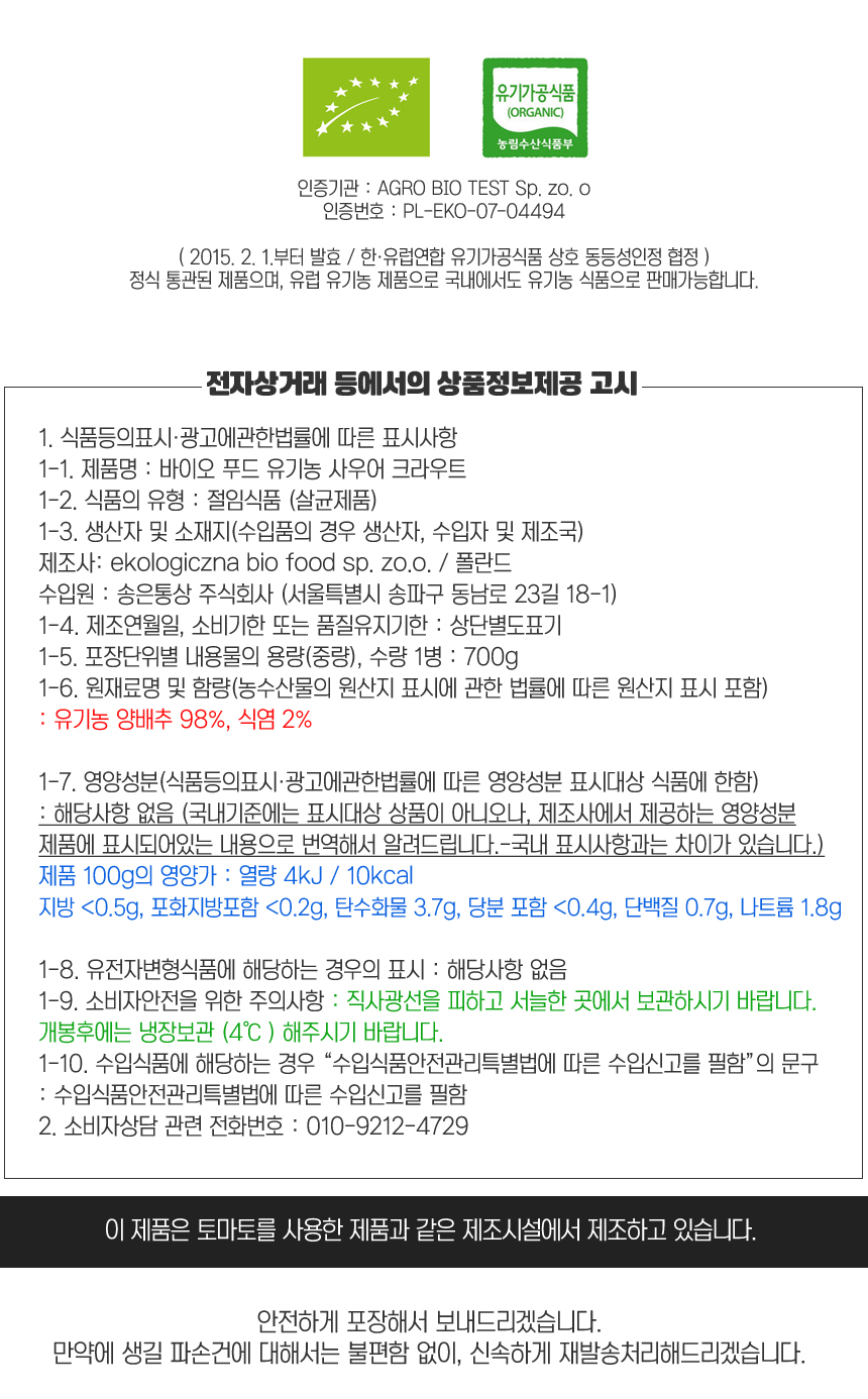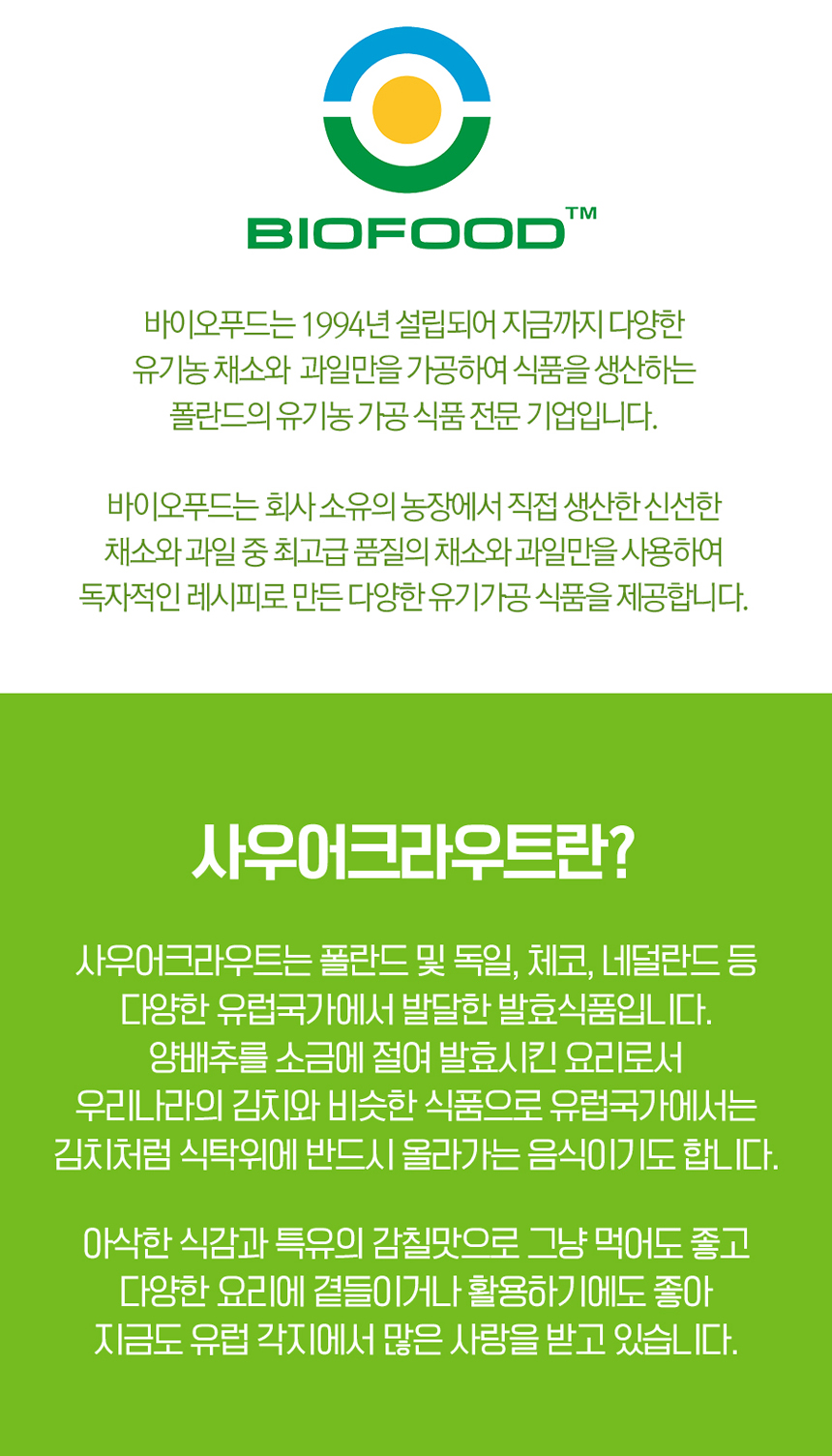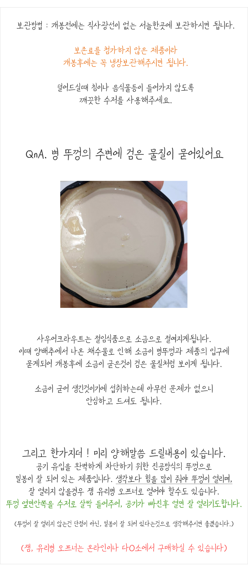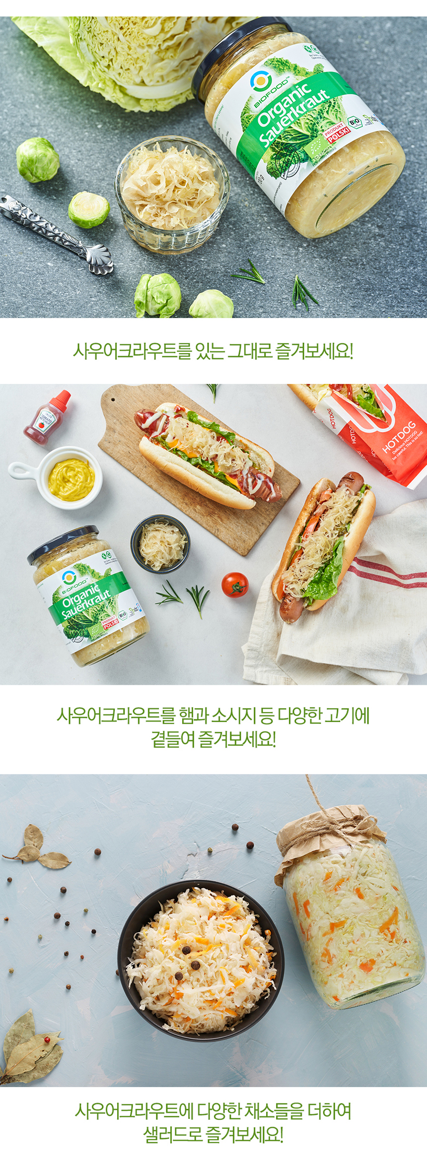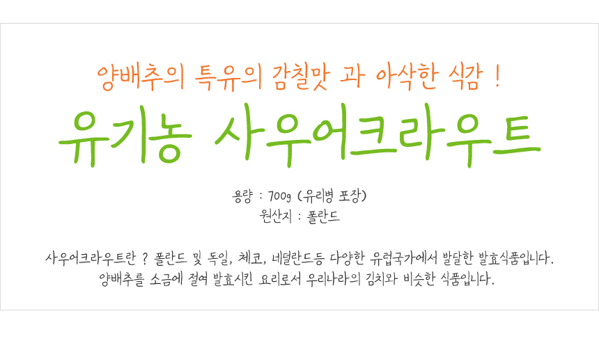 유기농 양배추를 저온 살균한 뒤, 염장하여 숙성 공정을