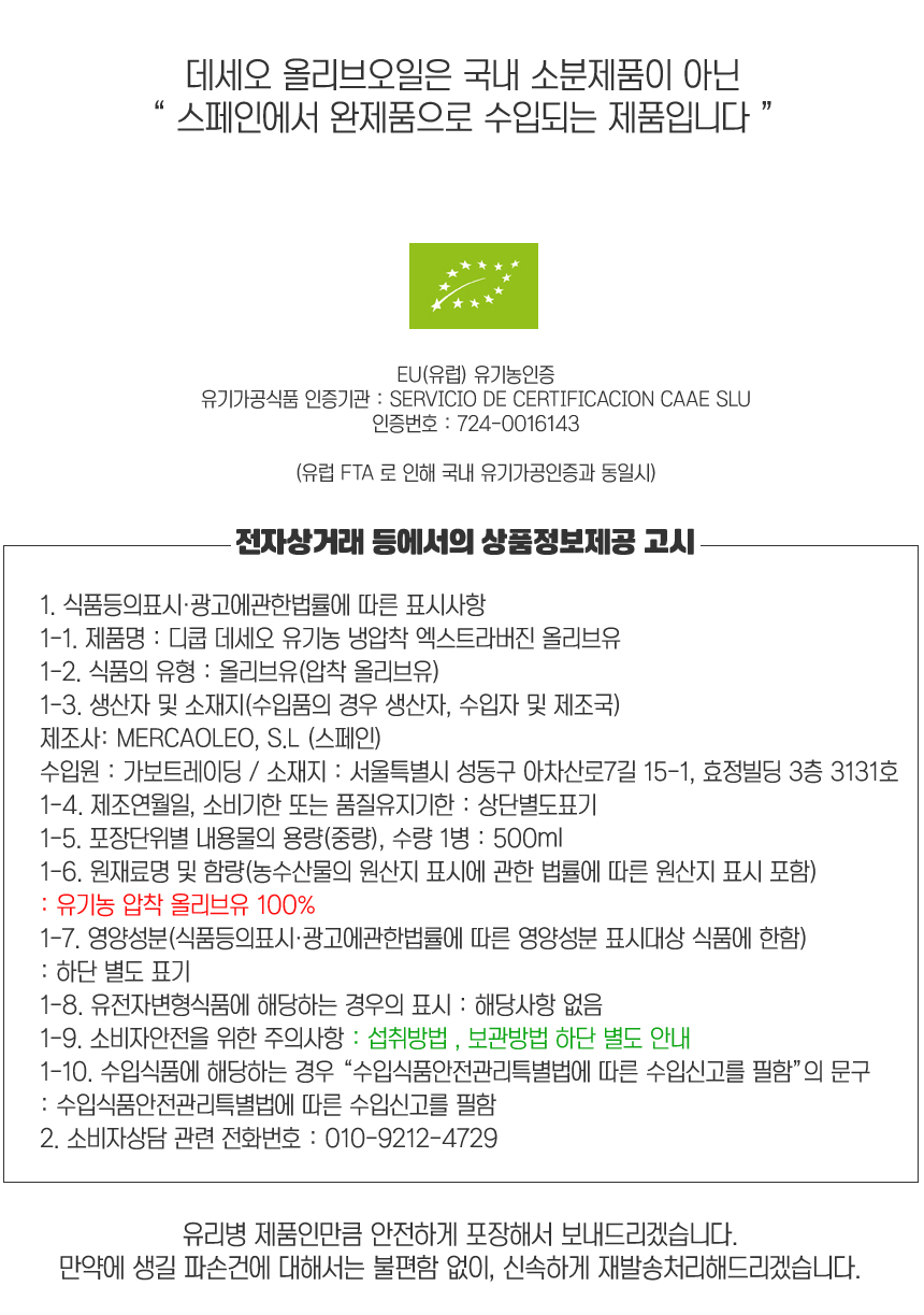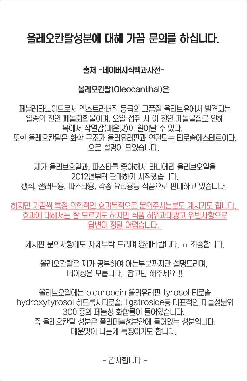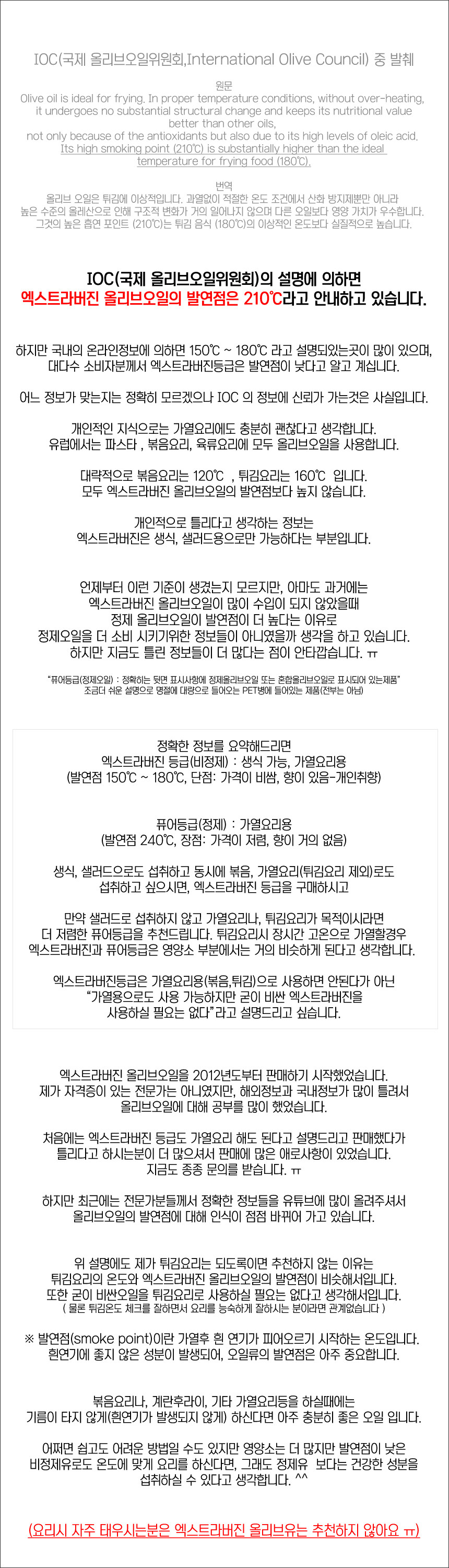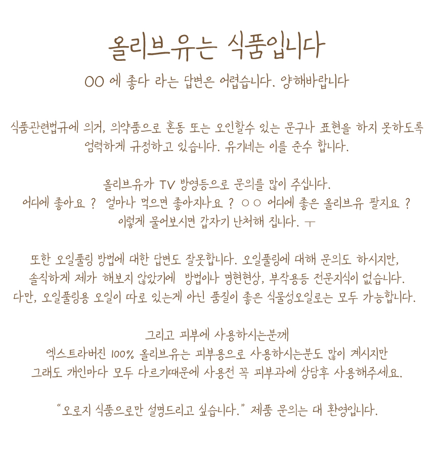 즉, 법적 표시사항인 식품 유형에는 냉압착 올리브를 표시하면 안되며, "압착올리브유" 라고 표시해야 합니다.