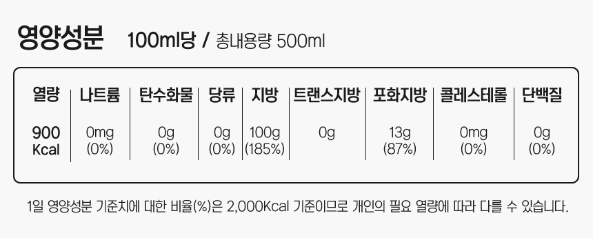식물성 오일이지만 기름이라 상당히 느끼하며, 폴리페놀 성분이 들어있어 매운맛이 납니다.