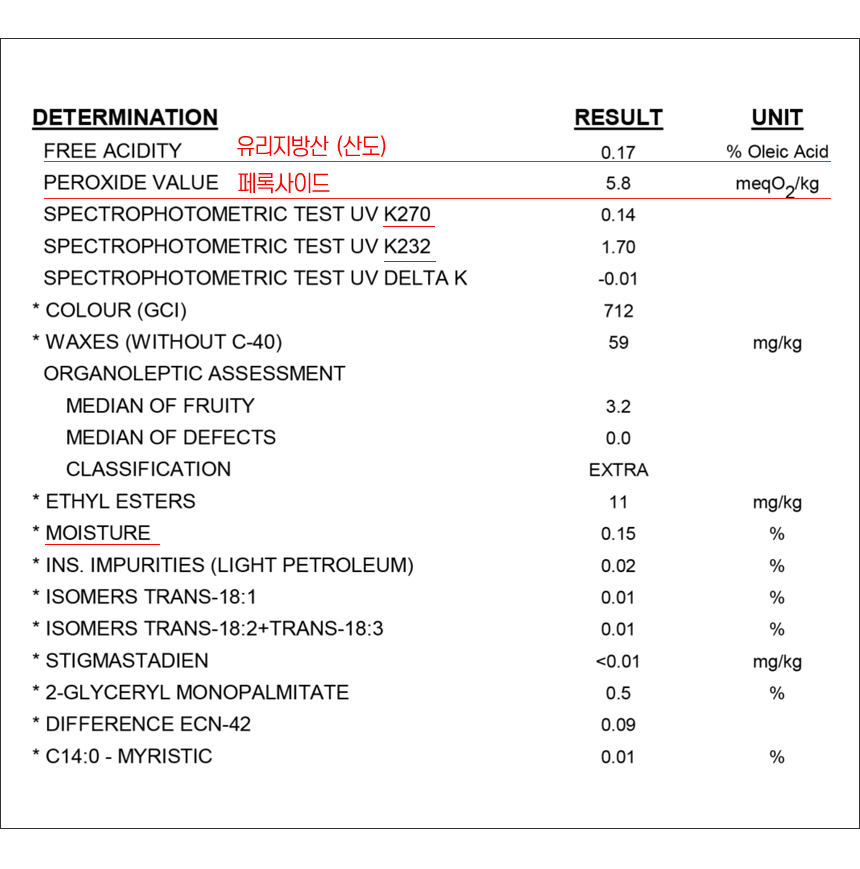 ▶오일 구매시 산도도 중요하지만, 과산화물(하단설명)이나 그외 수치도 아주 중요합니다. 아래 성분검사서를 참고하시면 됩니다.
