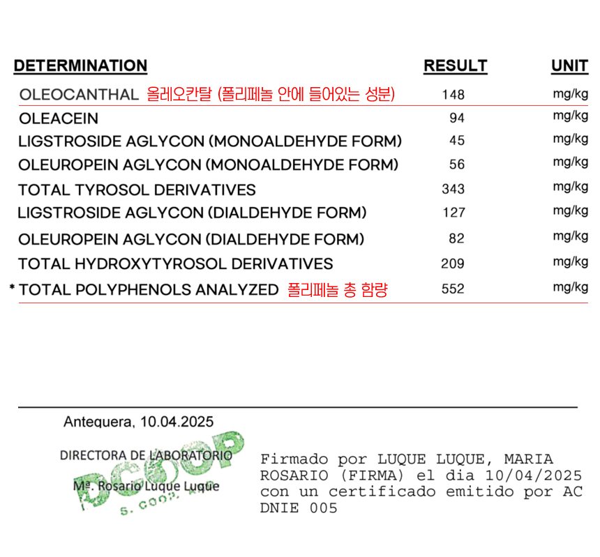 올레오칸탈 148 mg/kg , 폴리페놀 552 mg/kg