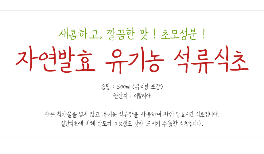 유기농 석류만을 사용하여 자연 발효시킨 식초입니다.
